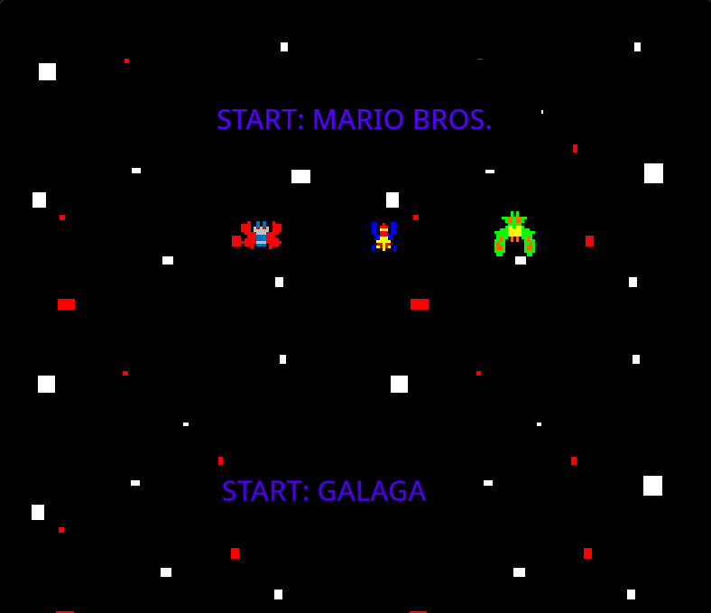 Click and play with Super Mario Bros. (complete) and Galaga (work in progress).